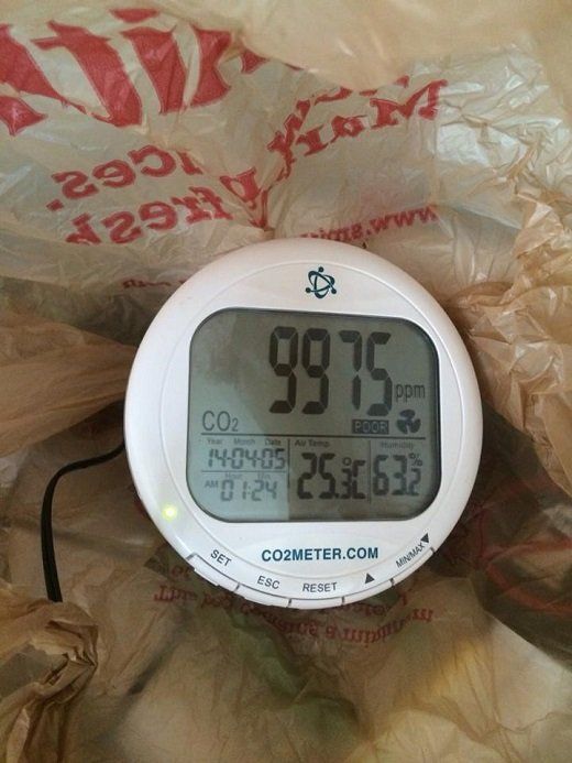 I should get an O2 meter now. Since 10,000 ppm of CO2 is only 1% and normal air is around 20% oxygen, there is probably a lot more oxygen still in the bag than CO2, but breathing this much CO2 for a long time would still be dangerous.