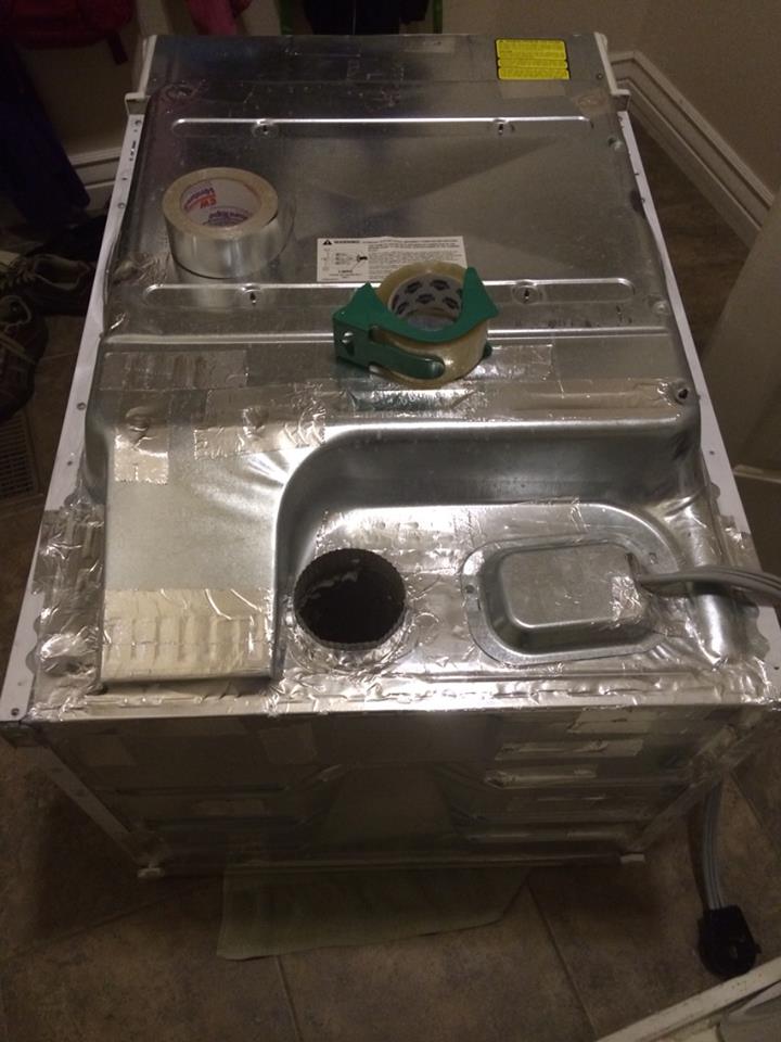 So the blower motor could better draft in its own air from the attic, I sealed off all the seams and vent holes in the clothes dryer (except for the exhaust hole).