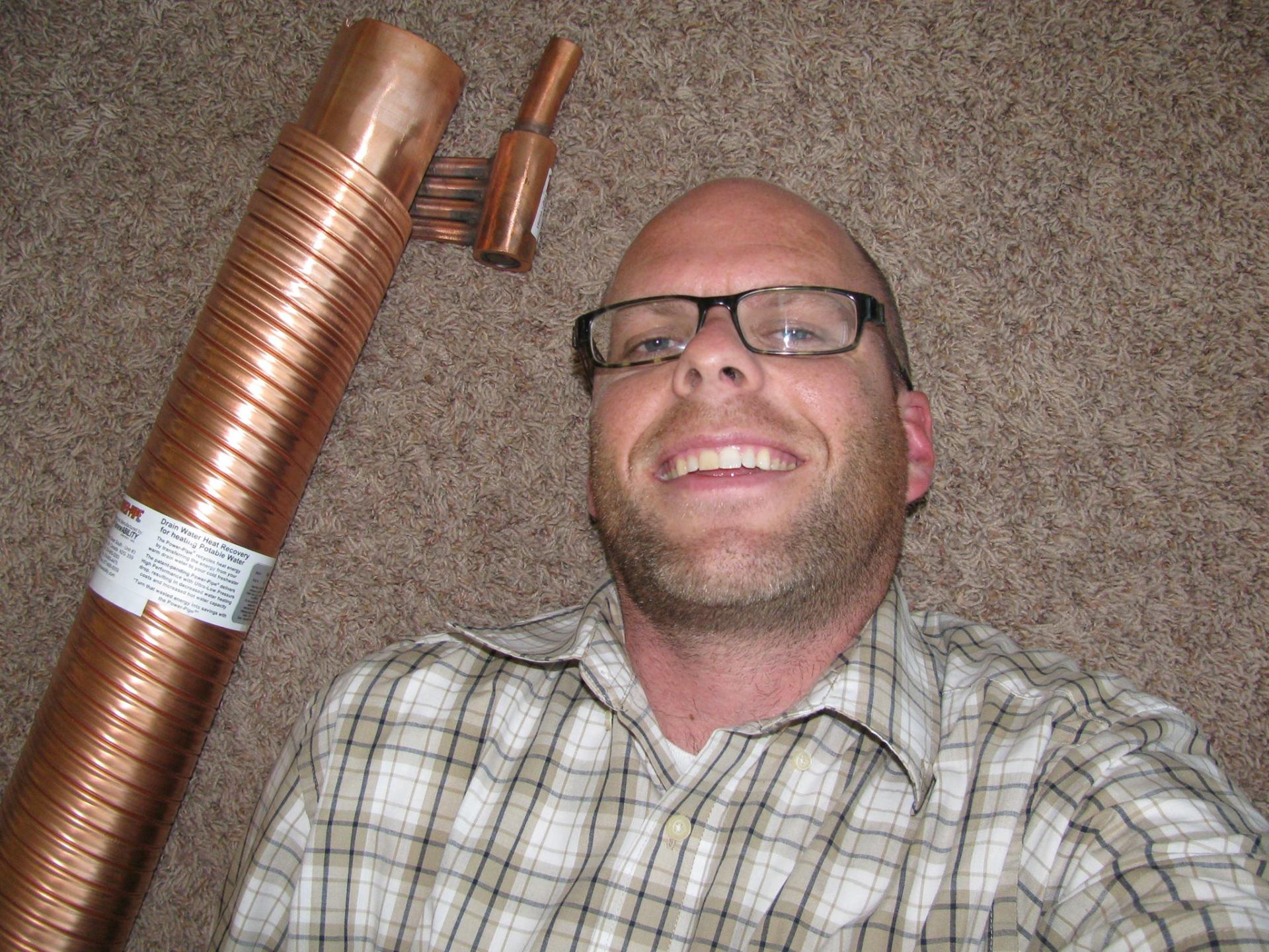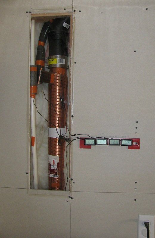 According to google, it takes an average of 20,000,000 BTUs to mine and refine 1 ton of pure copper, (or 10,000 BTUs of energy to mine and refine 1 pound of pure copper). The 48" long 3" diameter DWHR unit I installed is nearly 100% copper and weights 19 pounds. So by using these figures, it required 190,000 BTUs to mine and refine the copper that went into it. For good measure let's add on an additional 10,000 BTUs to manufacture it (form copper into various pipes and coil the smaller rectangular pipes around the larger 3" diameter cylindrical pipe).