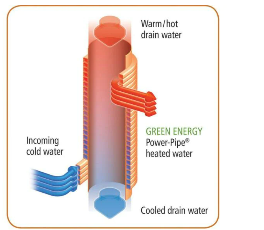 When water runs down a vertical sewer pipe, rather than falling down the center very quickly, it glides down the inside wall of the pipe. In a heat recovering drain, a section of the vertical sewer pipe is replaced with a thermally conductive copper one where a smaller, copper, culinary water pipe is wrapped around the copper sewer pipe. In this manner, heat from warm/hot waste water (and nothing else, ew!) is transferred to the cold water on its way to the water heater.