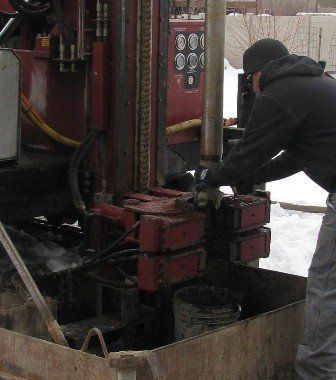 Once the ground loop is fed down the center of the drill casing to the bottom of the hole, they begin to pull up the drill casing one section at a time.