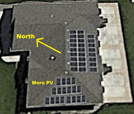 Here is what our roof 'might' look like after we install 18 more PV panels. The panels in the middle-right (of the above satellite photo) are the existing 240 watt panels and face south-east. The panels on the bottom (photo-shopped), are 295 watt panels and will face south-west. I estimate these new panels will perform,(watt for watt), about as well as the original array.