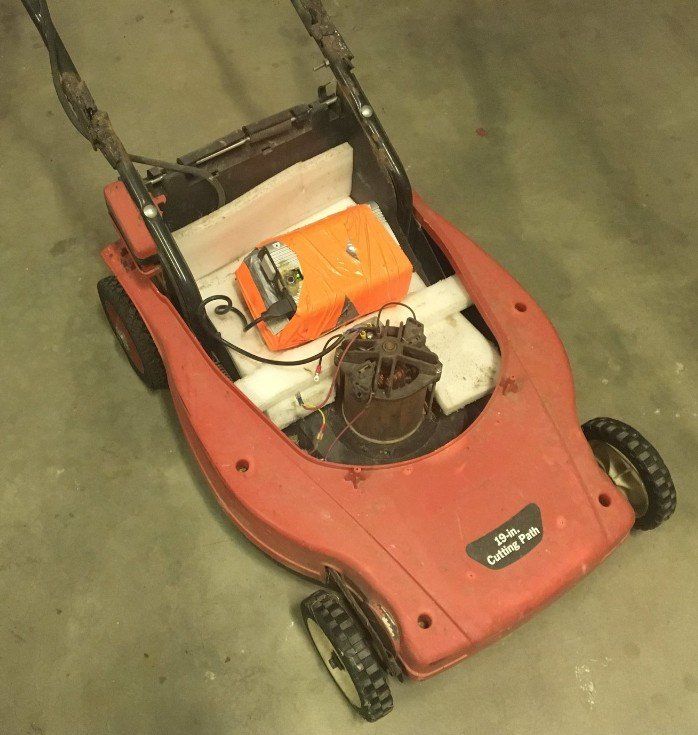 Frankenstein has been a great lawn mower. He started out as a regular plug-in electric lawn mower. A couple years later, I added a large 12 V marine battery and an inverter. This made him cordless and worked well but was very heavy. A few years later I upgraded to larger wiring on the 12 V circuit which bought a longer run-time.