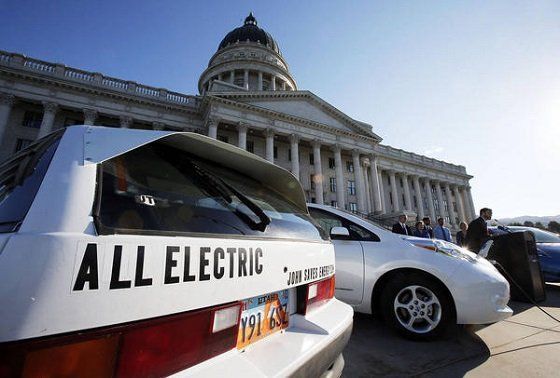 The Geo EV at the Capitol building with Edith (our Leaf) in the background.