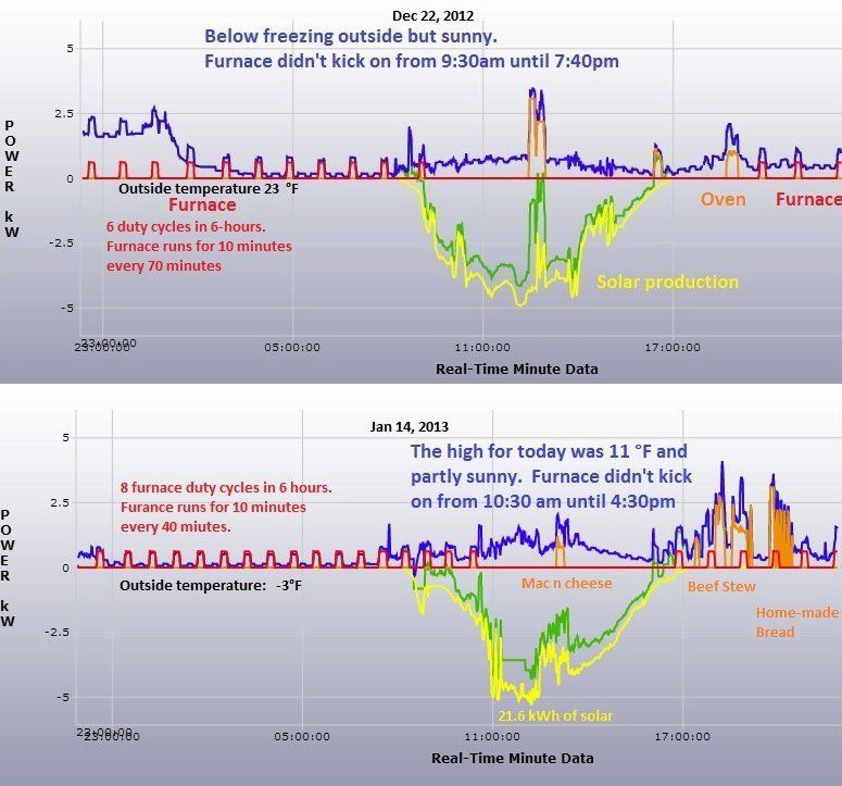 Here are a couple of shots from TED (back when we still had our gas furnace), showing the passive heating of our house on a couple of partly cloudy, winter days. The first it was 23°F outside and the other it was 11°F. The red trace is power draw of the furnace blower. The yellow trace is the sunlight based on solar panel production.