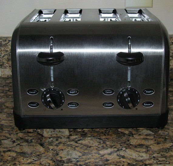 We bought a new toaster to replace the antiquated, fickle toaster oven. It's a fancy toaster with 2 and 4 slice options. It takes 90 seconds to make a batch of toast. It draws 700 watts for 2 slices and 1400 watts for 4 slices.