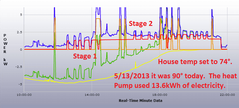 All the while, the house remained consistently comfortable. When the compressor inside the heat pump turns on, it is almost always in stage one, the lowest power consuming stage.