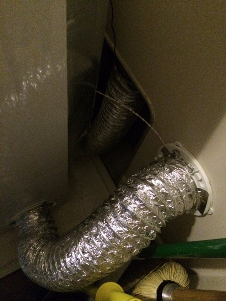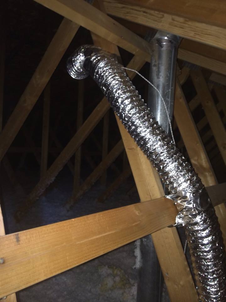 The attic air duct runs down the same wall where the dryer exhaust runs outside. Hot, dry, attic air in; moist, exhaust air out.