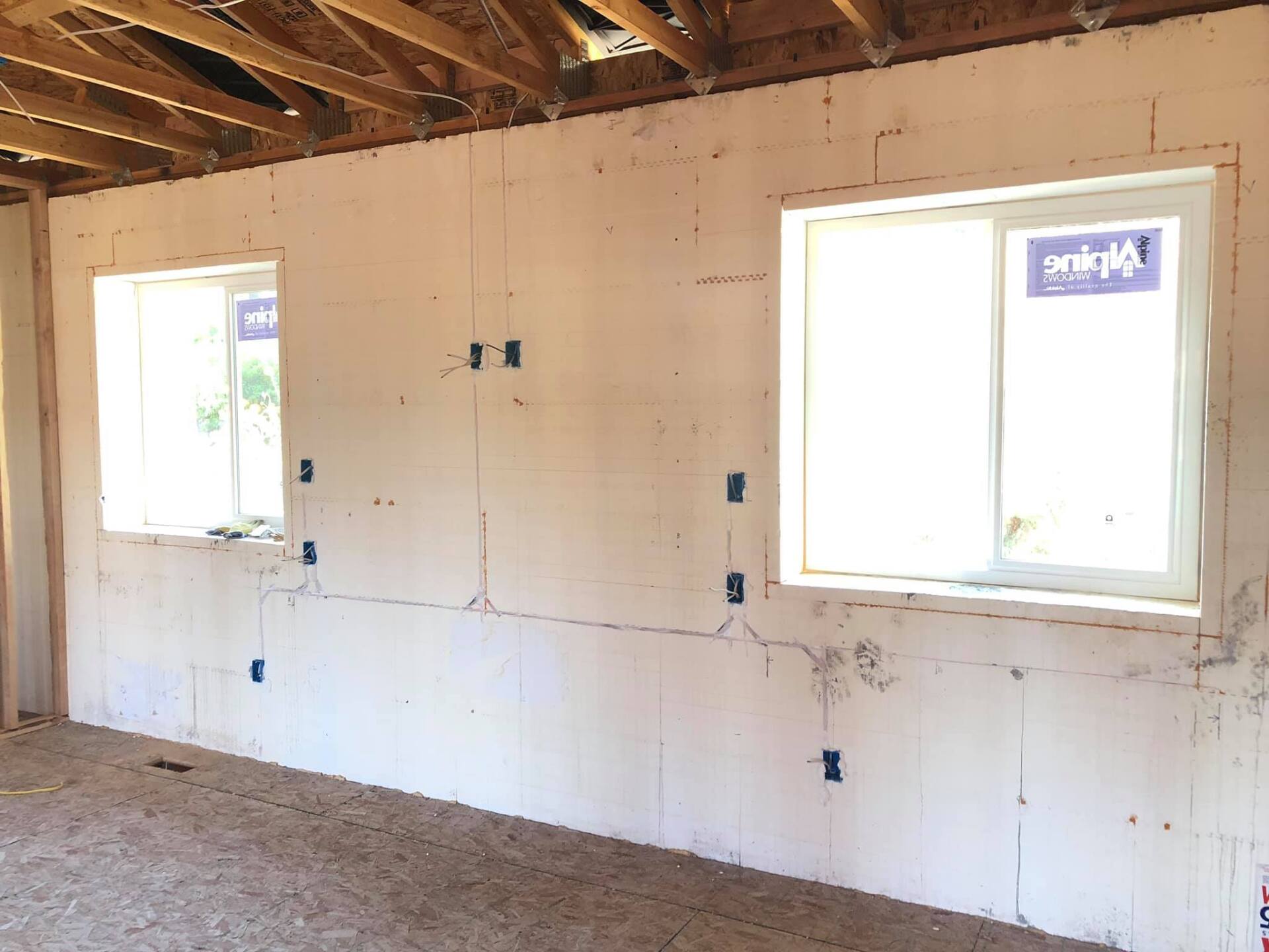 Electrical cables embedded into an ICF wall, prior to foaming back up.