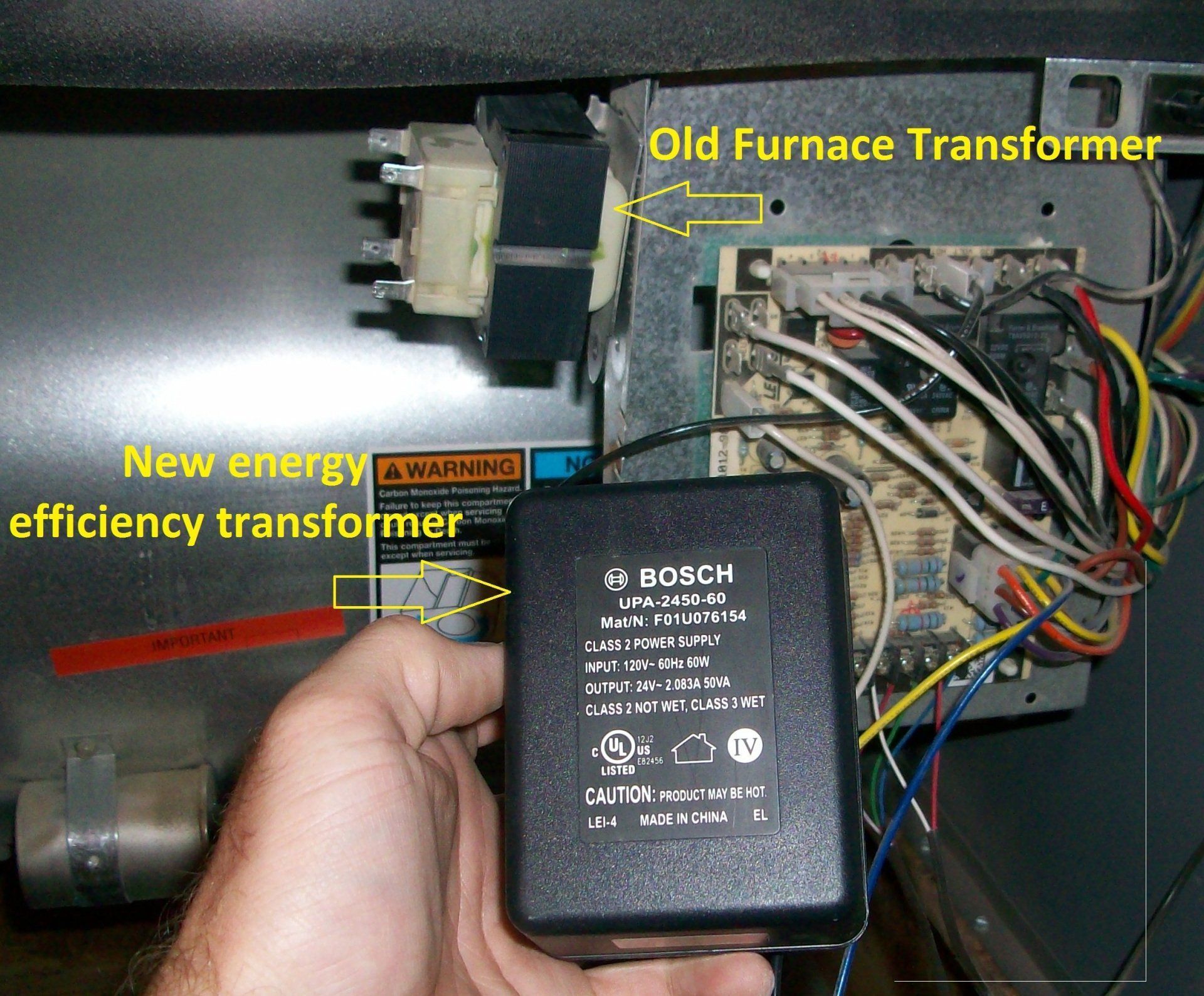 The furnace has a loud buzzing transformer that runs its circuitry all the time. I swapped it out with an energy efficient Bosch one and now in standby it draws 3 watts instead of 9 watts.